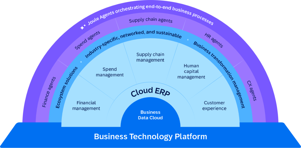 Platforma jest częścią szerszego ekosystemu SAP Business Technology Platform (BTP) i obejmuje kilka kluczowych komponentów – w tym SAP Datasphere, będący następcą SAP Data Warehouse Cloud.